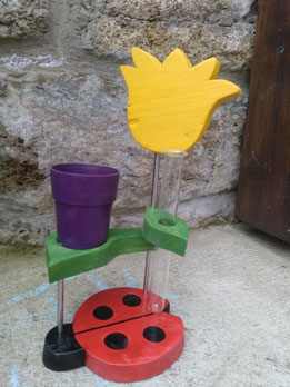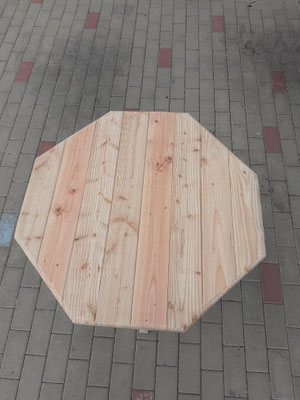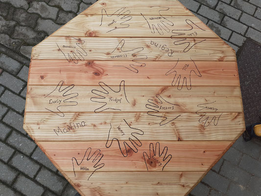 Zum 60. Geburtstag einer der Erzieherinnen im Kindergarten legten die Eltern zusammen und schenkten ihr diesen individuell mit den Handabdrücken der Kinder verzierten Gartentisch aus Douglasie.