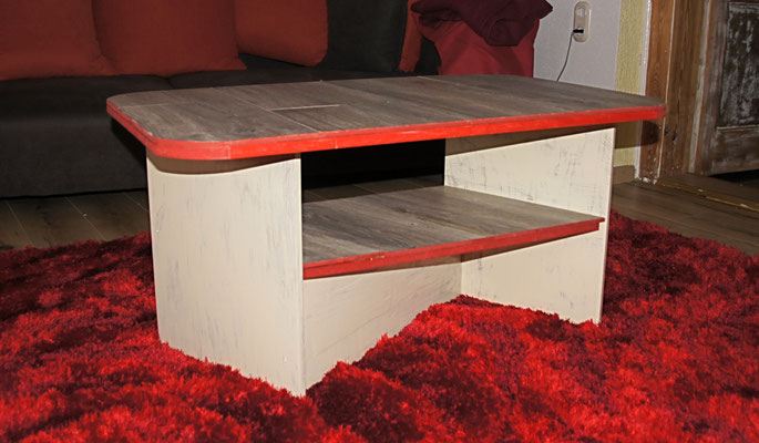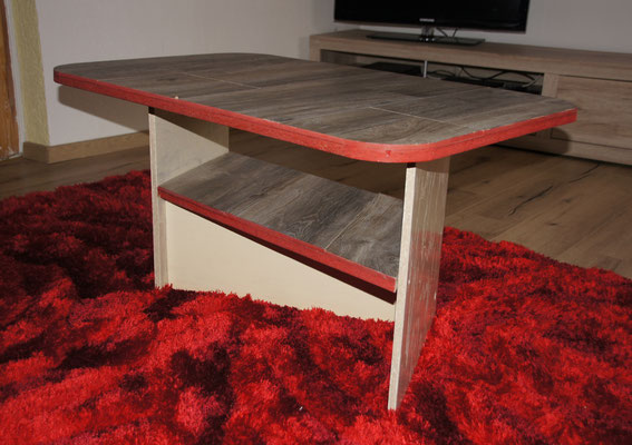 Was wird aus einer nicht mehr zeitgemäßen Schrankwand aus Preßspanbrettern? In Kombination mit Laminat-Resten und etwas Farbe ein neuer Couchtisch ;-)